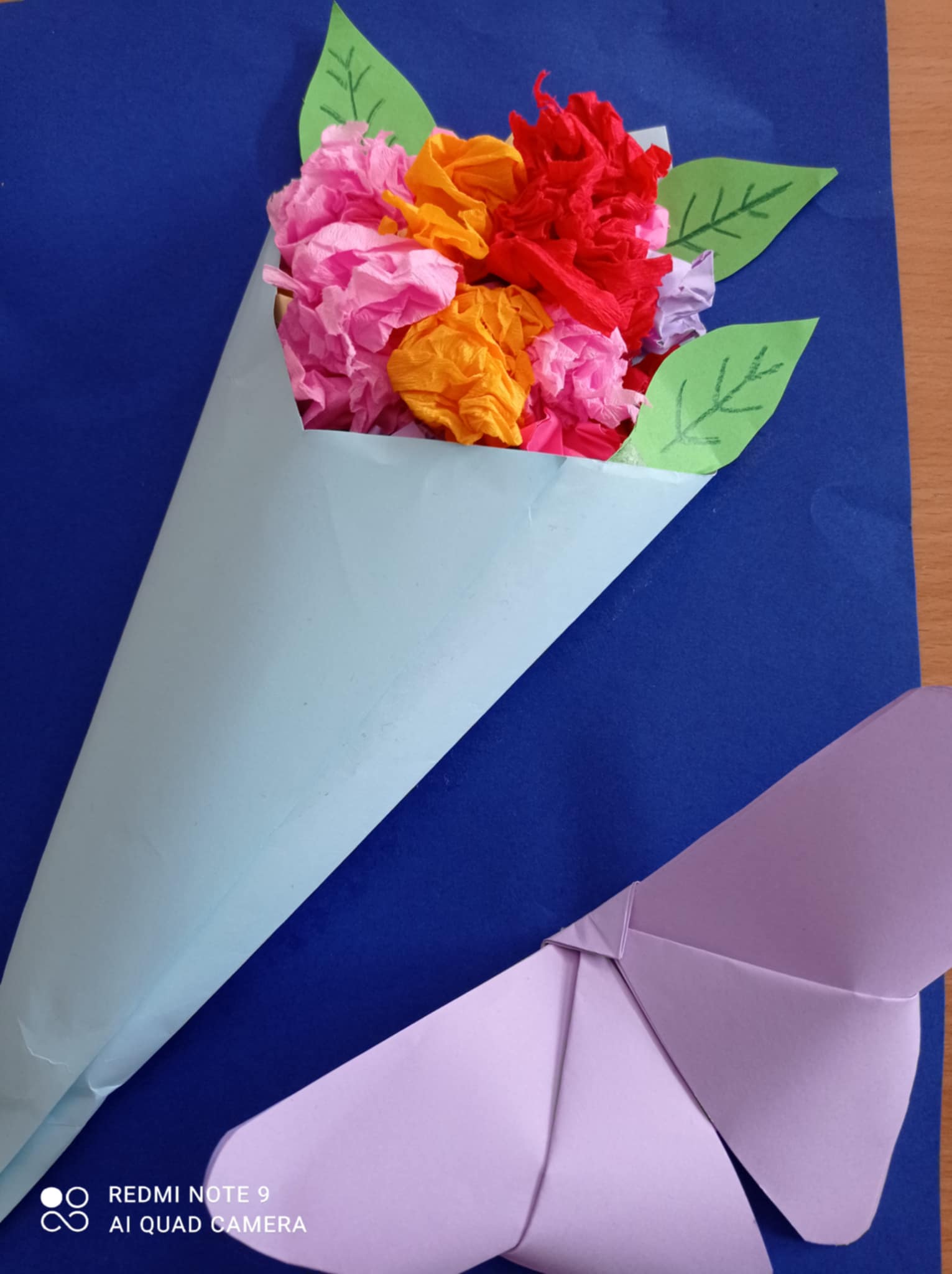 Piękne bukiety z bibuły, a wszystko dla mamy z okazji jej święta. Wręczone z radością, bo wykonane samodzielnie.